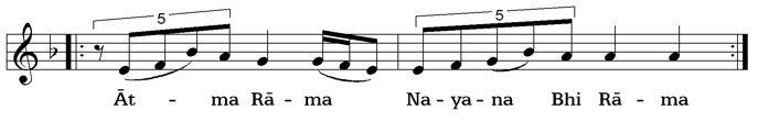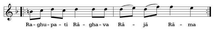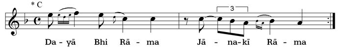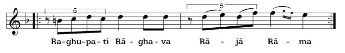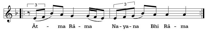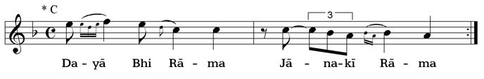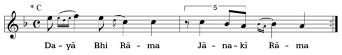 By the sign |- - - -- - - -| an interjection is marked. This is usually only sung in the fast repetition of the bhajan: whole line, interjection, whole line again.