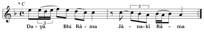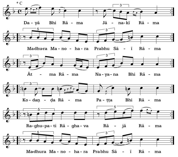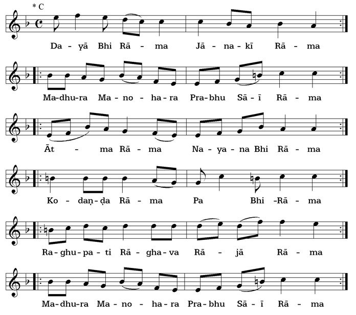 To make it easier to grasp the melodic structure and the mode or rāga, all bhajans are uniformly written with C as ground-note (drone).