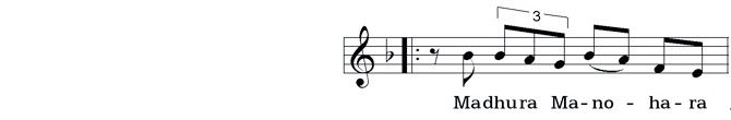Indian music also uses various non-diatonic scales. The name of the mode or ṭhāṭ (tone scale) is written after the title of the bhajan, also the tone scale in Indian Sargam (e.g. S R g m P d N S’). The corresponding accidentals are marked at the beginning of each line of the notes.