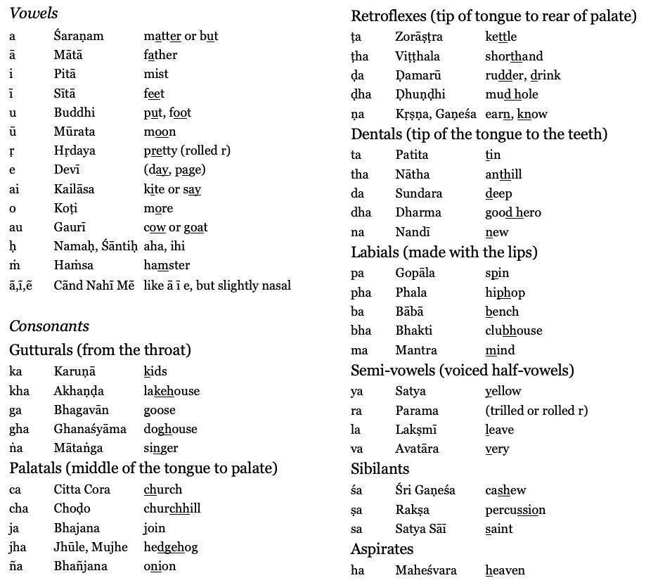 The Bhajan texts in this book are written in the internationally used scientific transliteration (IAST) of Indian scripts. Using the table on the right side helps to learn the correct pronunciation.
