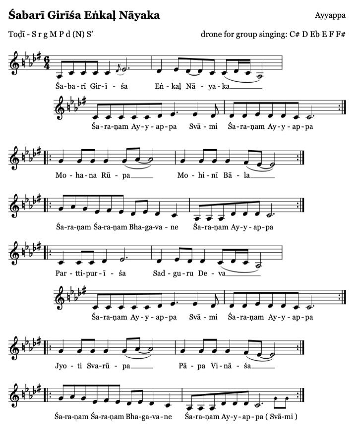 Wir unterwerfen uns unserem Führer Ayyappa, der Gottheit der Wahrheit und Gerechtigkeit, dem Herrn des Berges Shabari in Kerala.