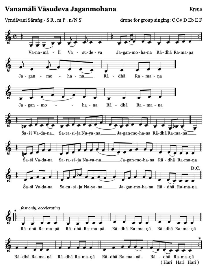 Oh, Krishna mit der Girlande aus Waldblumen, Sohn von Vasudeva, Du ziehst die ganze Welt an, Du bist eine Freude für Deine Dich liebende Radha.